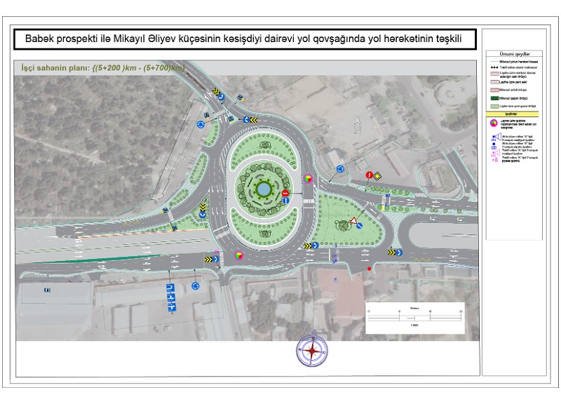 Dentro del proyecto en curso, se están instalando semáforos para regular el tráfico en la rotonda y de los vehículos que se dirigen al pueblo de Yeni Gunashli a través del tramo auxiliar de la avenida Babek, y se establecerá un tráfico circular en las direcciones que ingresan a la rotonda.